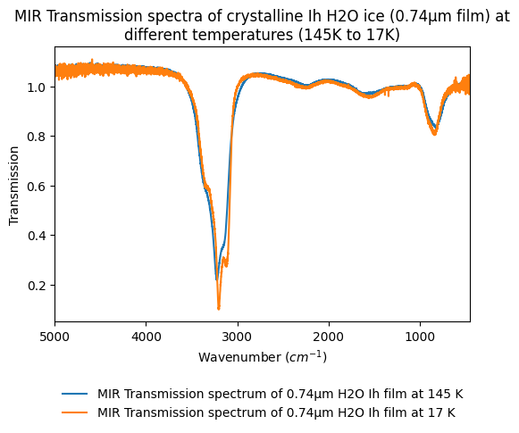 - MIR Transmission spectra of crystalline Ih H2O ice (0.74µm film) at different temperatures (145K to 17K)