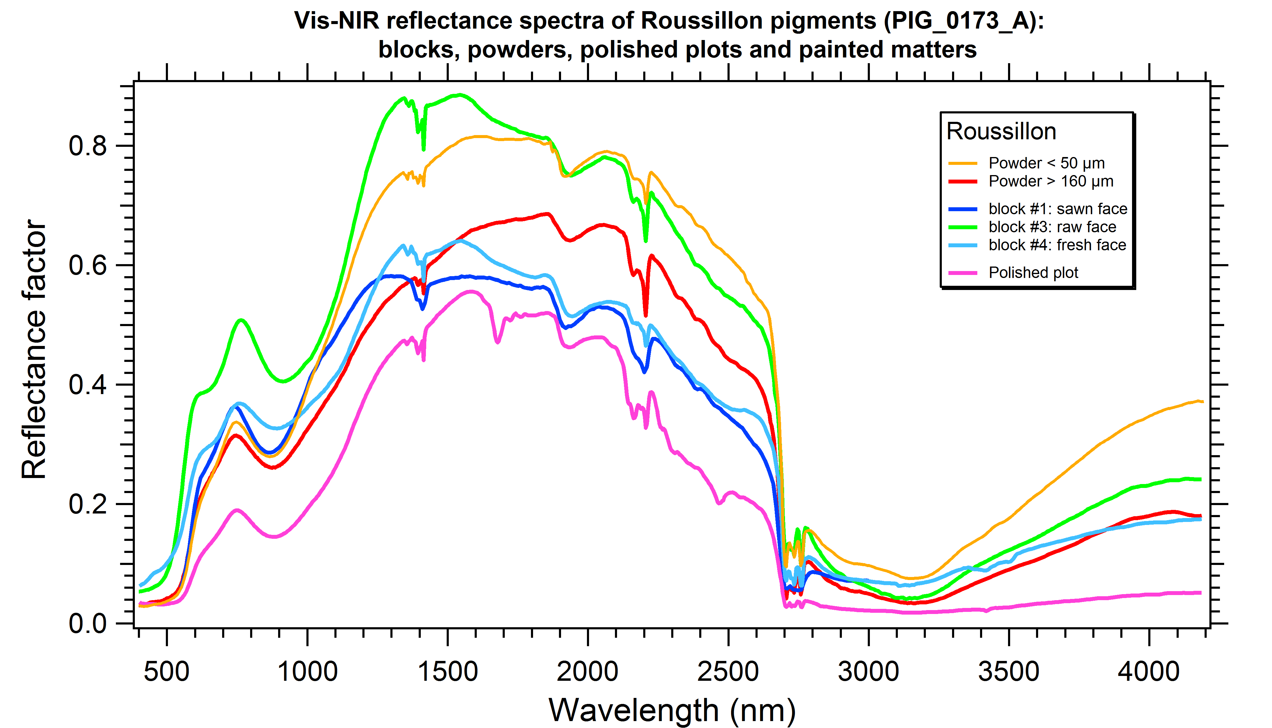 Vis-NIR reflectance spectra of Roussillon pigments (PIG_0173_A): raw blocks, powders with different grain sizes and painted matter