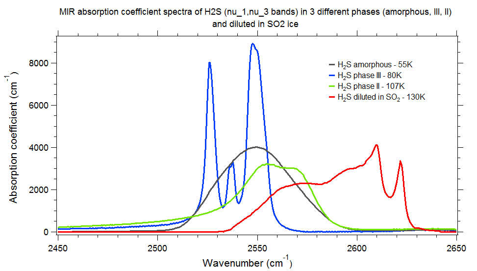 - MIR absorption coefficient spectra of H2S (around the nu_1,nu_3 bands) in 3 different phases (amorphous (56K), III (85K), II (107K)) and diluted in SO2 ice (130K)