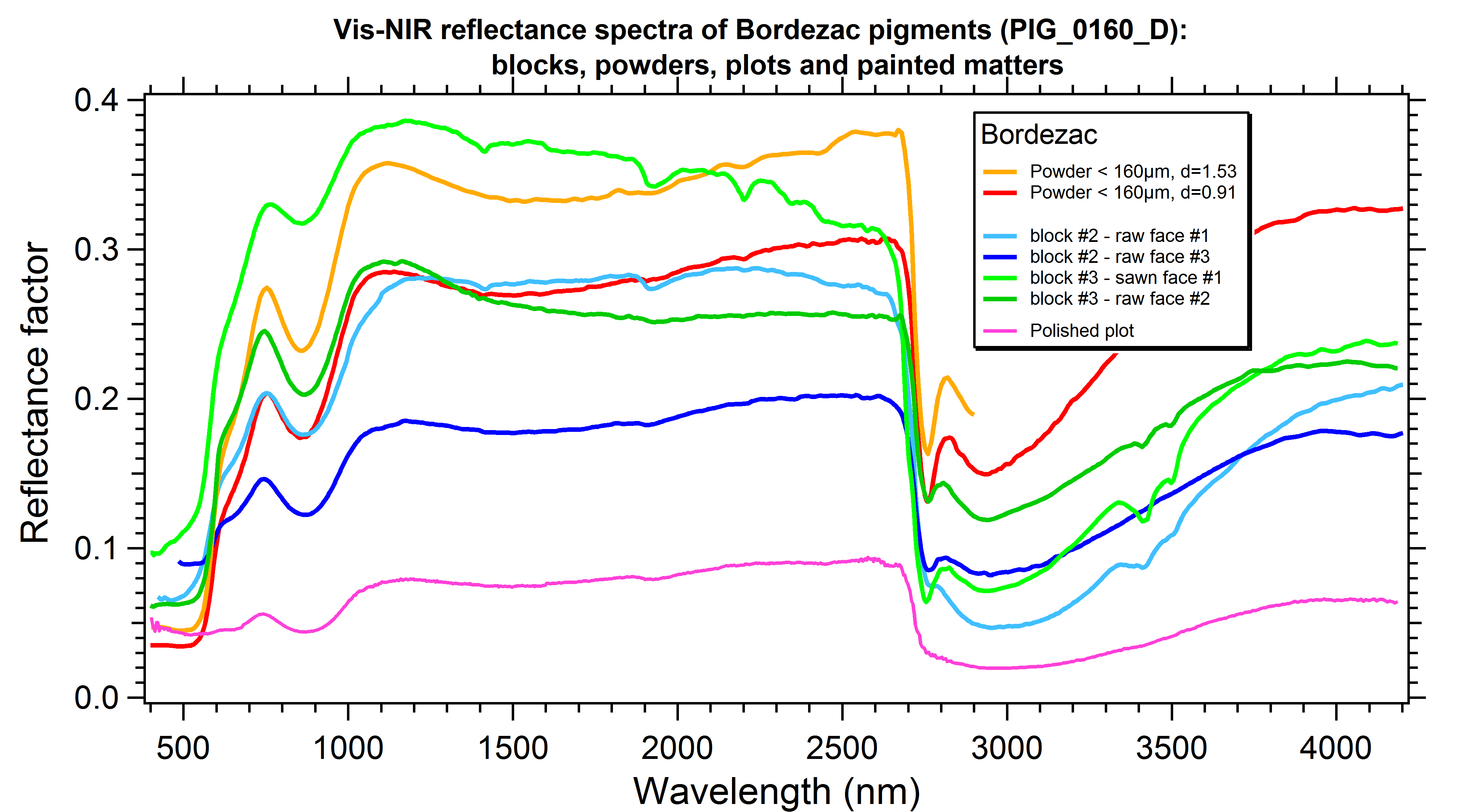 - Vis-NIR reflectance spectra of Bordezac pigments (Pig_0160_D) as 2 raw blocks and 1 sawn (2 faces each), as a powder with grain sizes < 160 µm (2 densities: 0.91 and 1.53 g/cm3), as a polished plot and a painted matter on limestone