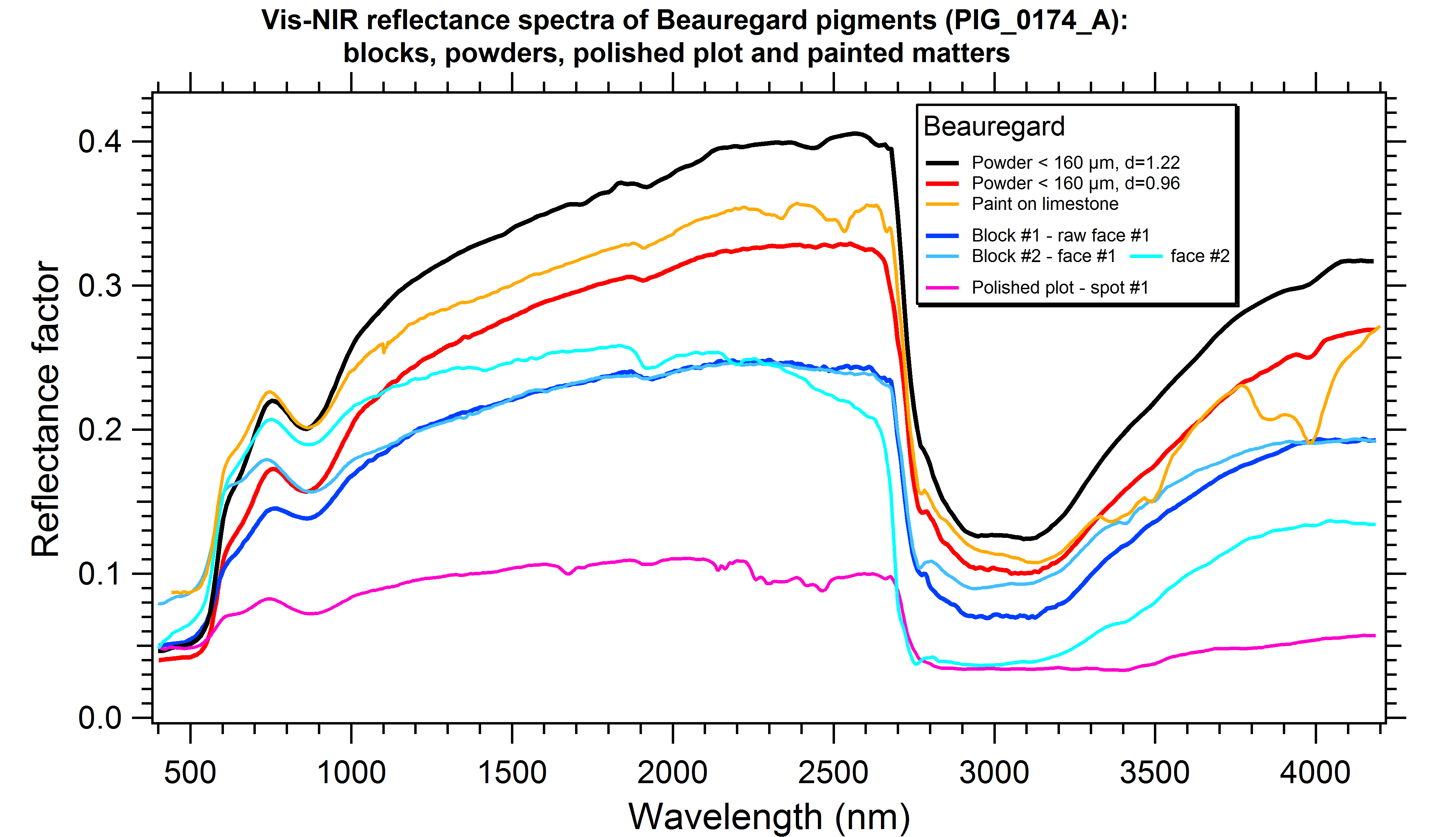 - Vis-NIR reflectance spectra of Beauregard pigments (PIG_0174_2016) as raw blocks, powders with grain sizes < 160 µm (2 densities: 0.96 and 1.22), polished plot and a painted matter on limestone
