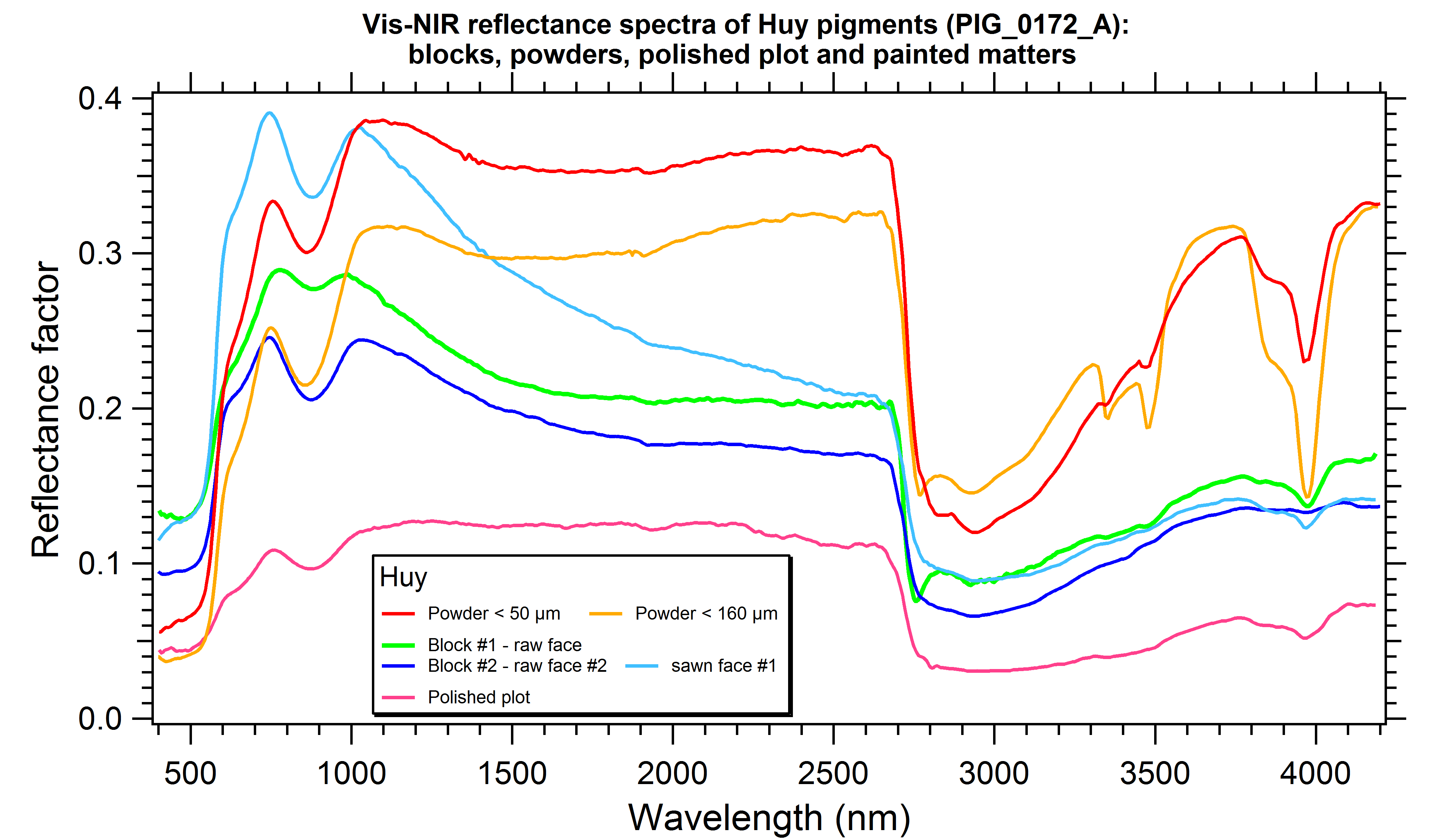 - Vis-NIR reflectance spectra of Huy pigments (PIG_0172_A) as 1 raw block and 1 sawn (2 faces each), as powders with several grain sizes (<50µm, <160 µm, 100-200µm, 200-400µm, >400µm) and several densities, as a polished plot, and a painted matter on limestone