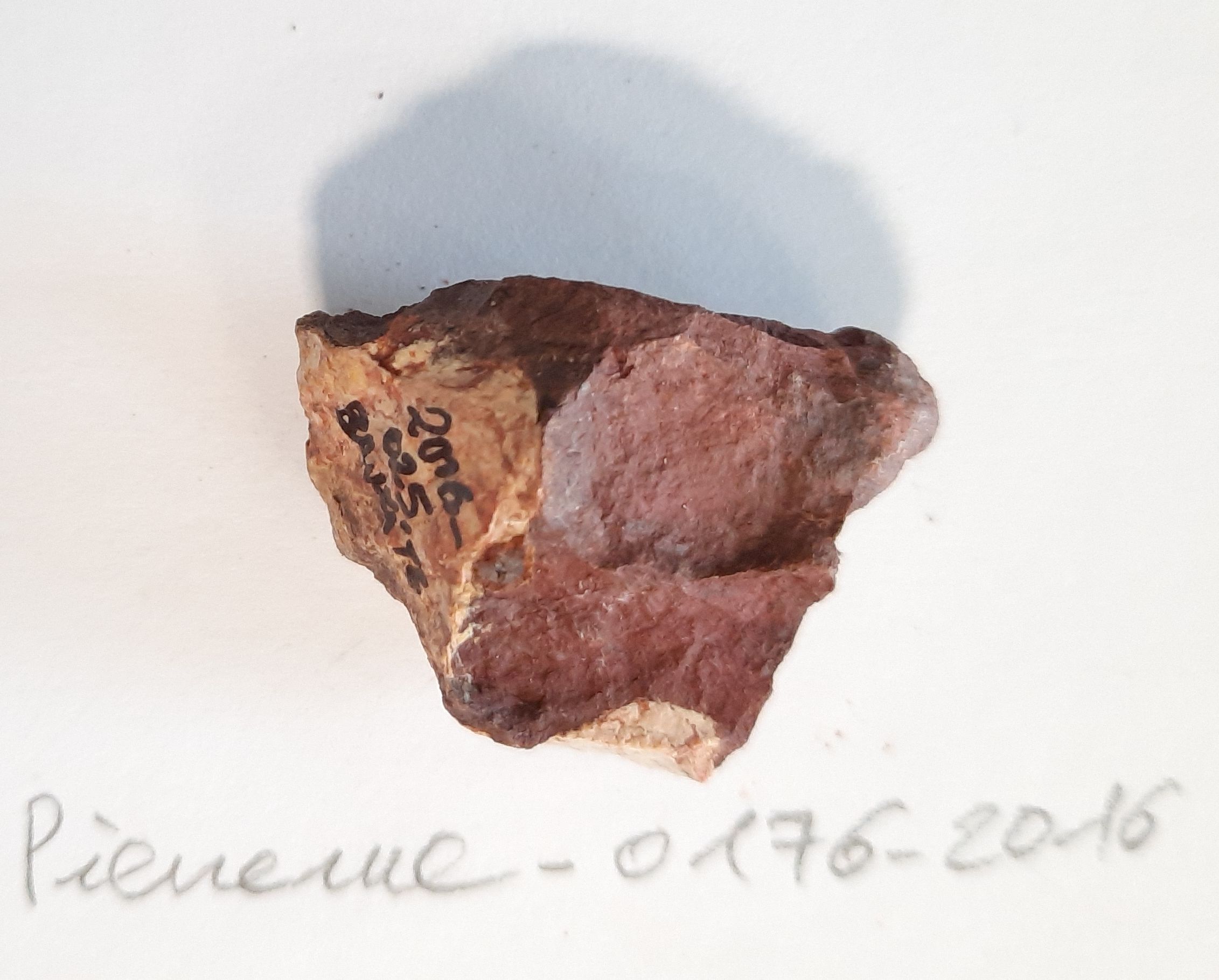 - small irregular red block with some concave faces (faces #1 and #2). Two other faces with white fractured surficial layer