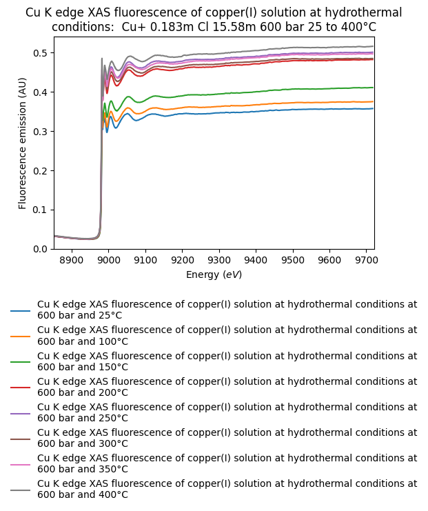 - Cu K edge XAS fluorescence of copper(I) solution at hydrothermal conditions: Cu+ 0.183m Cl 15.58m 600 bar 25 to 400°C