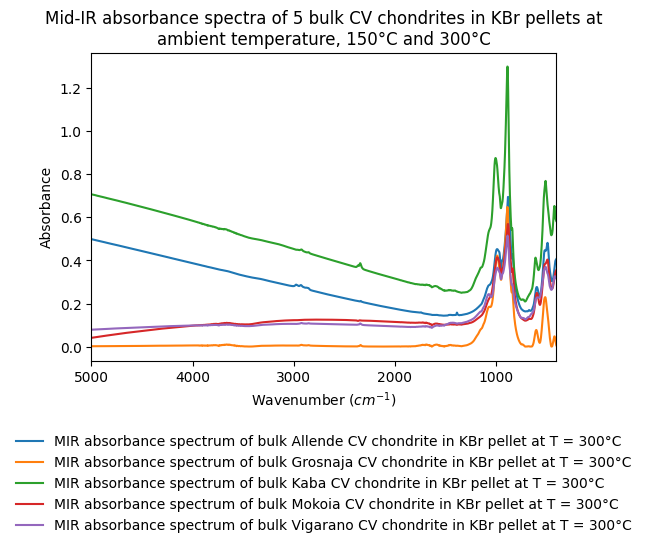 - Mid-IR absorbance spectra of 5 bulk CV chondrites in KBr pellets at ambient temperature, 150°C and 300°C