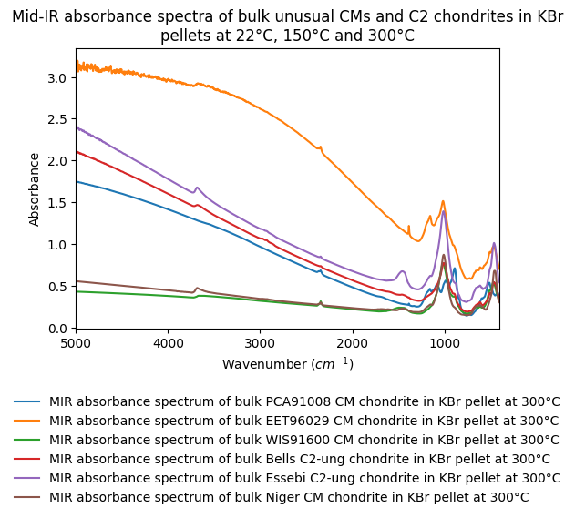 - Mid-IR absorbance spectra of bulk unusual CMs and C2 chondrites in KBr pellets at 22°C, 150°C and 300°C