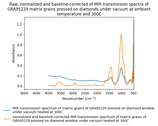 - Raw, normalized and baseline-corrected of MIR transmission spectra of GRA95229 matrix grains pressed on diamonds under vacuum at ambiant temperature and 300C