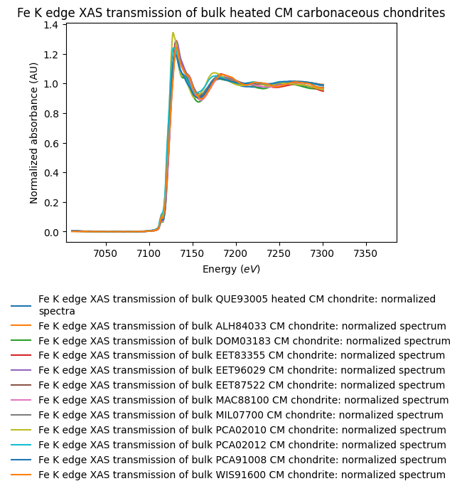 - raw and normalized Fe K edge XAS transmission of bulk heated CM carbonaceous chondrites