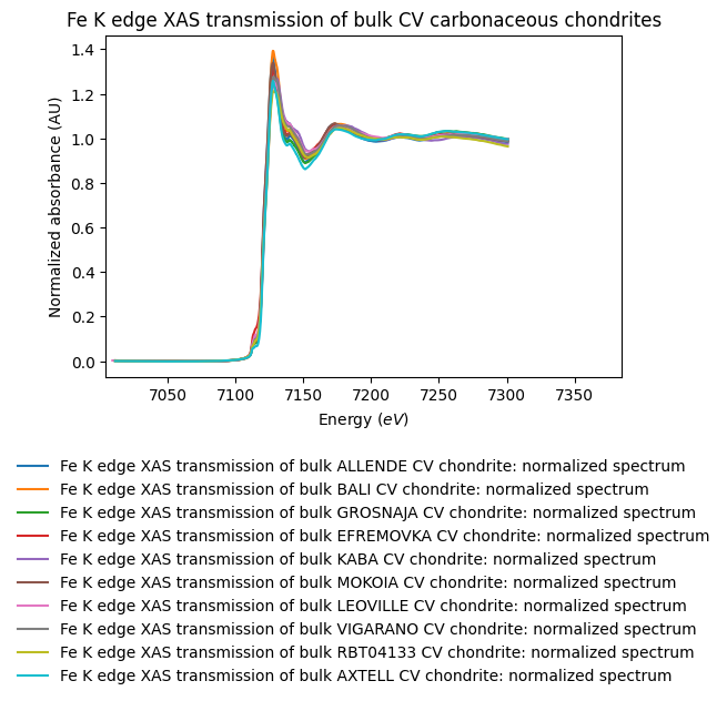 - Garenne, Alexandre; Bonal, Lydie; Beck, Pierre; Proux, Olivier (2013): Fe K edge XAS transmission of bulk CV carbonaceous chondrites. SSHADE/GhoSST+FAME (OSUG Data Center). Dataset/Spectral Data. https://doi.org/10.26302/SSHADE/EXPERIMENT_LB_20191211_005