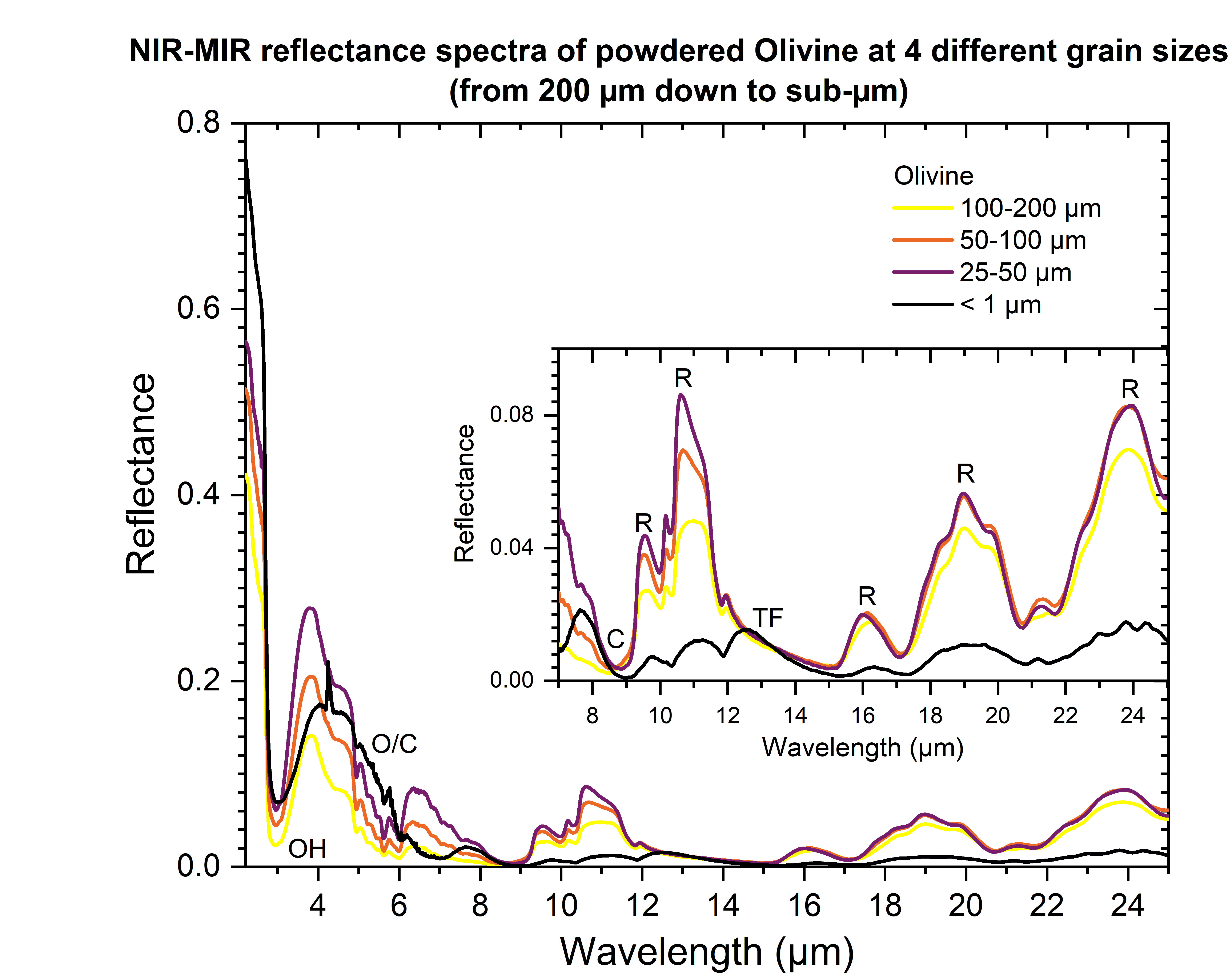 - We measured the reflectance spectra (from 1 to 25 µm) of powders of olivine. The powders were grinded and sieved and the spectra of four size fractions were measured: 100-200 µm, 50-100 µm, 25-50 µm, and sub-micrometer sized grains.