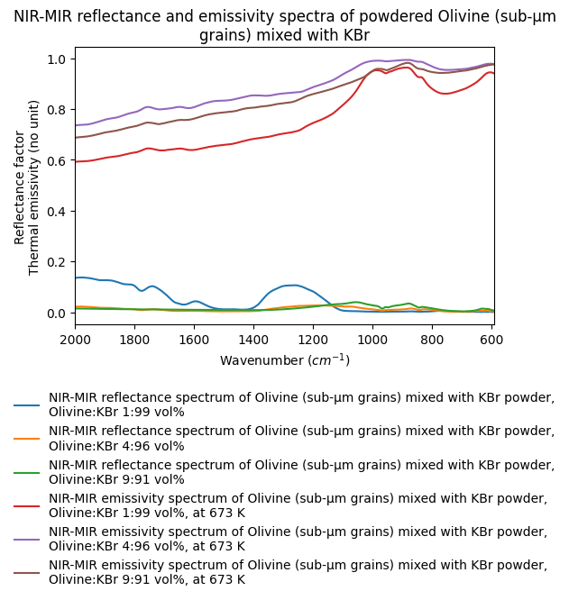 - NIR-MIR reflectance and emissivity spectra of powdered Olivine (sub-µm grains) mixed with KBr