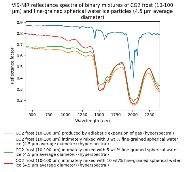 - VIS-NIR reflectance spectra of binary mixtures of CO2 frost (10-100 µm) and fine-grained spherical water ice particles (4.5 µm average diameter)