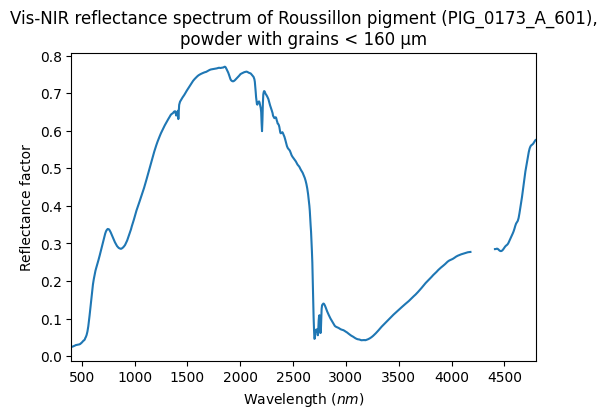 - Schmitt, Bernard; Chalmin-Aljanabi, Emilie; Chassin de Kergommeaux, Aurélie (2019): Vis-NIR reflectance spectra of Roussillon pigments (PIG_0173_A): raw blocks, powders with different grain sizes and painted matter. SSHADE/PIG (OSUG Data Center). Dataset/Spectral Data. https://doi.org/10.26302/SSHADE/EXPERIMENT_BS_20191012_400