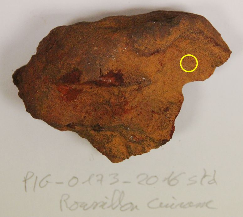 - Schmitt, Bernard; Chalmin-Aljanabi, Emilie; Chassin de Kergommeaux, Aurélie (2019): Vis-NIR reflectance spectra of Roussillon pigments (PIG_0173_A): raw blocks, powders with different grain sizes and painted matter. SSHADE/PIG (OSUG Data Center). Dataset/Spectral Data. https://doi.org/10.26302/SSHADE/EXPERIMENT_BS_20191012_400