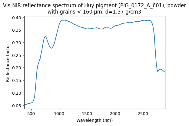 - Schmitt, Bernard; Chalmin-Aljanabi, Emilie; Chassin de Kergommeaux, Aurélie (2019): Vis-NIR reflectance spectra of Huy pigments (PIG_0172_A): blocks, powders, plots and painted matters. SSHADE/PIG (OSUG Data Center). Dataset/Spectral Data. https://doi.org/10.26302/SSHADE/EXPERIMENT_BS_20200813_100