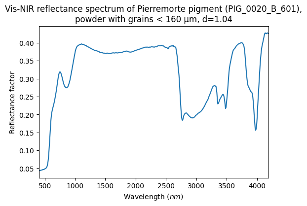 - Schmitt, Bernard; Chalmin-Aljanabi, Emilie (2019): Vis-NIR reflectance spectra of Pierremorte pigments (PIG_0020_A and B): blocks, powders, polished plot and painted matters. SSHADE/PIG (OSUG Data Center). Dataset/Spectral Data. https://doi.org/10.26302/SSHADE/EXPERIMENT_BS_20200815_100