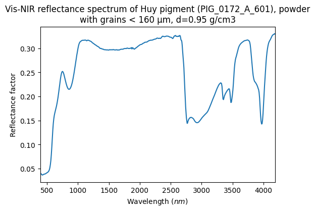 - Schmitt, Bernard; Chalmin-Aljanabi, Emilie; Chassin de Kergommeaux, Aurélie (2019): Vis-NIR reflectance spectra of Huy pigments (PIG_0172_A): blocks, powders, plots and painted matters. SSHADE/PIG (OSUG Data Center). Dataset/Spectral Data. https://doi.org/10.26302/SSHADE/EXPERIMENT_BS_20200813_100