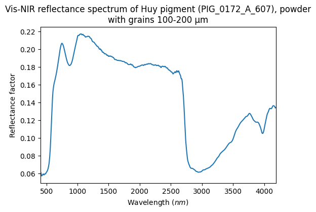 - Schmitt, Bernard; Chalmin-Aljanabi, Emilie; Chassin de Kergommeaux, Aurélie (2019): Vis-NIR reflectance spectra of Huy pigments (PIG_0172_A): blocks, powders, plots and painted matters. SSHADE/PIG (OSUG Data Center). Dataset/Spectral Data. https://doi.org/10.26302/SSHADE/EXPERIMENT_BS_20200813_100