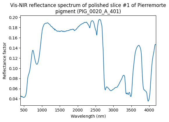 - Schmitt, Bernard; Chalmin-Aljanabi, Emilie (2019): Vis-NIR reflectance spectra of Pierremorte pigments (PIG_0020_A and B): blocks, powders, polished plot and painted matters. SSHADE/PIG (OSUG Data Center). Dataset/Spectral Data. https://doi.org/10.26302/SSHADE/EXPERIMENT_BS_20200815_100