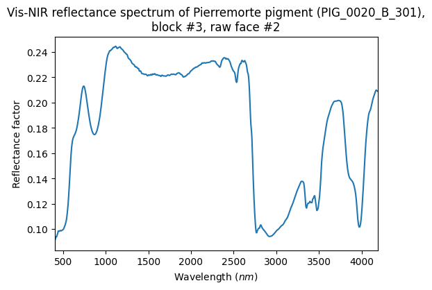 - Schmitt, Bernard; Chalmin-Aljanabi, Emilie (2019): Vis-NIR reflectance spectra of Pierremorte pigments (PIG_0020_A and B): blocks, powders, polished plot and painted matters. SSHADE/PIG (OSUG Data Center). Dataset/Spectral Data. https://doi.org/10.26302/SSHADE/EXPERIMENT_BS_20200815_100