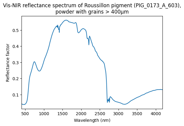 - Schmitt, Bernard; Chalmin-Aljanabi, Emilie; Chassin de Kergommeaux, Aurélie (2019): Vis-NIR reflectance spectra of Roussillon pigments (PIG_0173_A): raw blocks, powders with different grain sizes and painted matter. SSHADE/PIG (OSUG Data Center). Dataset/Spectral Data. https://doi.org/10.26302/SSHADE/EXPERIMENT_BS_20191012_400