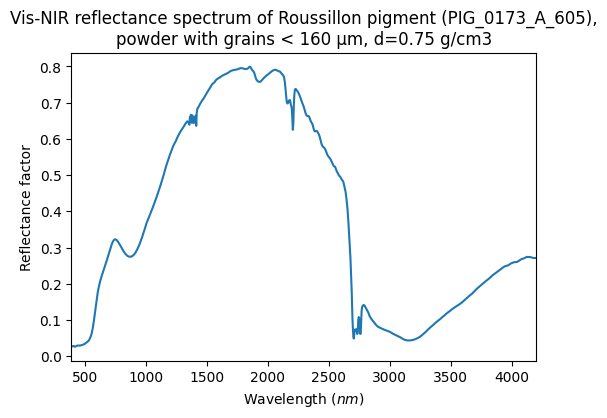 - Schmitt, Bernard; Chalmin-Aljanabi, Emilie; Chassin de Kergommeaux, Aurélie (2019): Vis-NIR reflectance spectra of Roussillon pigments (PIG_0173_A): raw blocks, powders with different grain sizes and painted matter. SSHADE/PIG (OSUG Data Center). Dataset/Spectral Data. https://doi.org/10.26302/SSHADE/EXPERIMENT_BS_20191012_400