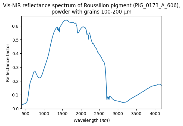 - Schmitt, Bernard; Chalmin-Aljanabi, Emilie; Chassin de Kergommeaux, Aurélie (2019): Vis-NIR reflectance spectra of Roussillon pigments (PIG_0173_A): raw blocks, powders with different grain sizes and painted matter. SSHADE/PIG (OSUG Data Center). Dataset/Spectral Data. https://doi.org/10.26302/SSHADE/EXPERIMENT_BS_20191012_400