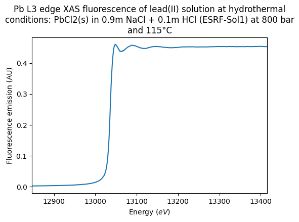 Pb L3 edge XAS fluorescence of lead(II) solution at hydrothermal conditions: PbCl2(s) in 0.1m HCl (ESRF-Sol2) at 800 bar and 115°C