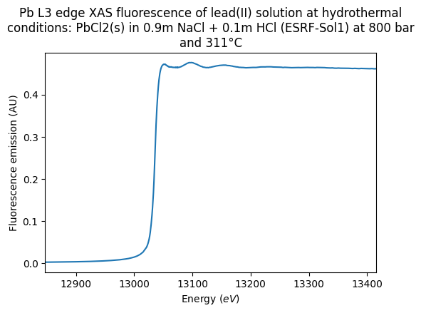 Pb L3 edge XAS fluorescence of lead(II) solution at hydrothermal conditions: PbCl2(s) in 0.9m NaCl + 0.1m HCl (ESRF-Sol1) at 800 bar and 311°C