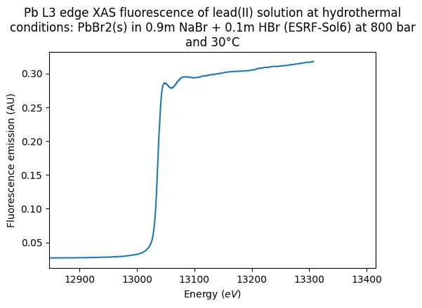 Pb L3 edge XAS fluorescence of lead(II) solution at hydrothermal conditions: PbBr2(s) in 0.9m NaBr + 0.1m HBr (ESRF-Sol6) at 800 bar and 30°C