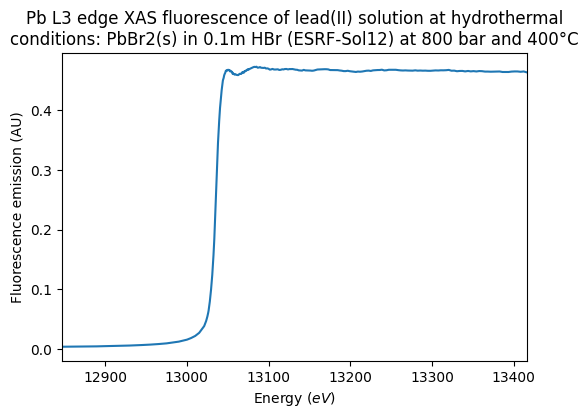 Pb L3 edge XAS fluorescence of lead(II) solution at hydrothermal conditions: PbBr2(s) in 0.1m HBr (ESRF-Sol12) at 800 bar and 400°C