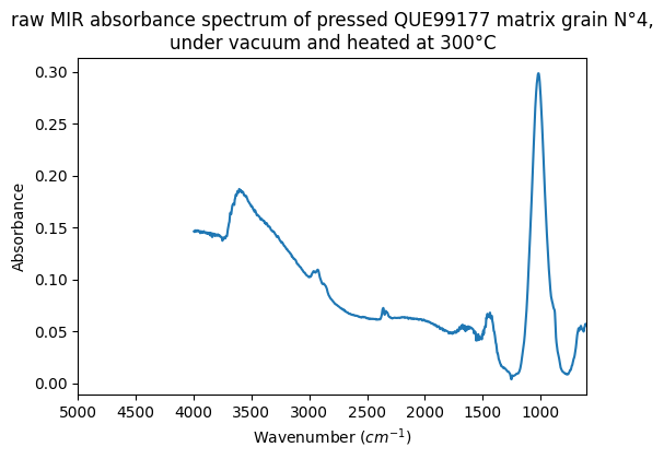 raw MIR absorbance spectrum of pressed QUE99177 matrix grain N°4, under vacuum and heated at 300°C