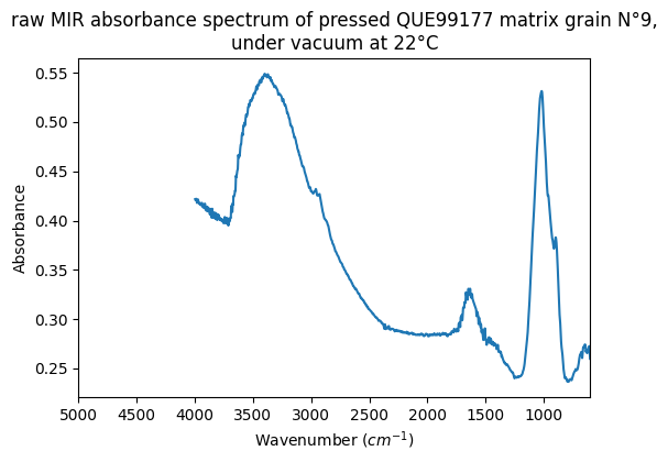 raw MIR absorbance spectrum of pressed QUE99177 matrix grain N°9, under vacuum at 22°C