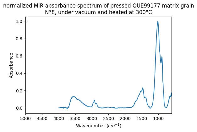 normalized MIR absorbance spectrum of pressed QUE99177 matrix grain N°8, under vacuum and heated at 300°C