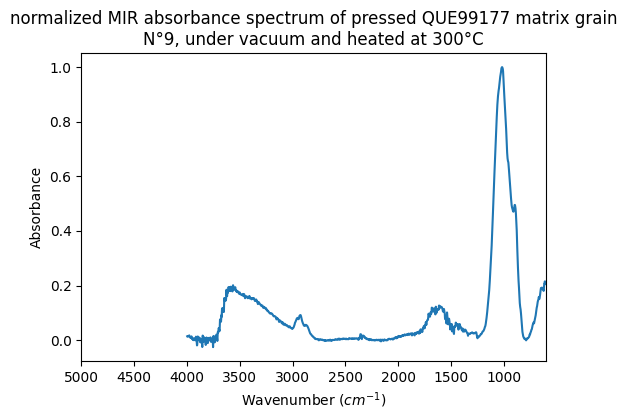 normalized MIR absorbance spectrum of pressed QUE99177 matrix grain N°9, under vacuum and heated at 300°C