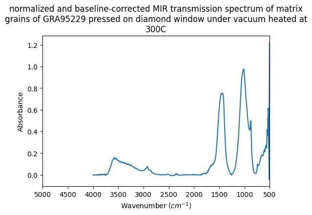 normalized and baseline-corrected MIR transmission spectrum of matrix grains of GRA95229 pressed on diamond window under vacuum heated at 300C