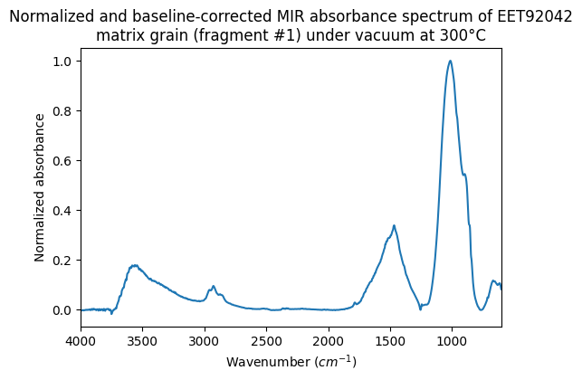Normalized and baseline-corrected MIR absorbance spectrum of EET92042 matrix grain (fragment #1) under vacuum at 300°C