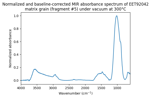 Normalized and baseline-corrected MIR absorbance spectrum of EET92042 matrix grain (fragment #5) under vacuum at 300°C