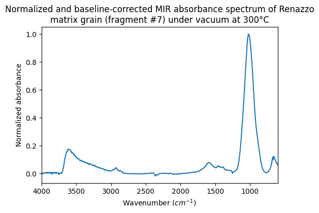 Normalized and baseline-corrected MIR absorbance spectrum of Renazzo matrix grain (fragment #7) under vacuum at 300°C