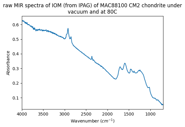 - Quirico, Eric; Flandinet, Laurene (2016): MIR spectra of IOM from CM and C2-ungrouped chondrites under vacuum and at T=80C. SSHADE/GhoSST (OSUG Data Center). Dataset/Spectral Data. https://doi.org/10.26302/SSHADE/EXPERIMENT_LB_20180718_001