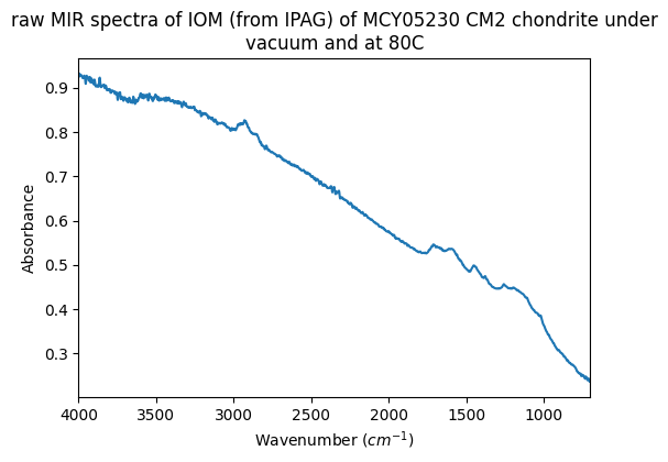 - Quirico, Eric; Flandinet, Laurene (2016): MIR spectra of IOM from CM and C2-ungrouped chondrites under vacuum and at T=80C. SSHADE/GhoSST (OSUG Data Center). Dataset/Spectral Data. https://doi.org/10.26302/SSHADE/EXPERIMENT_LB_20180718_001