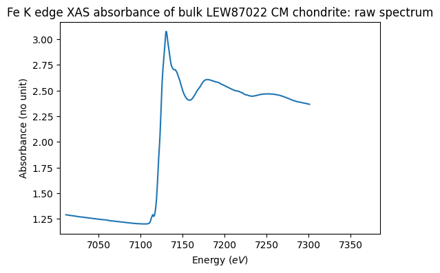 Fe K edge XAS absorbance of bulk LEW87022 CM chondrite: raw spectrum