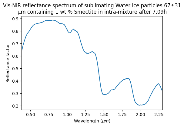 Vis-NIR reflectance spectrum of sublimating Water ice particles 67±31 μm containing 1 wt.% Smectite in intra-mixture after 9.17h