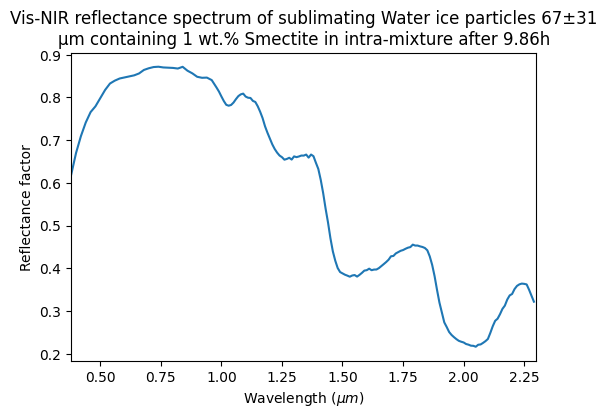 Vis-NIR reflectance spectrum of sublimating Water ice particles 67±31 μm containing 1 wt.% Smectite in intra-mixture after 9.17h