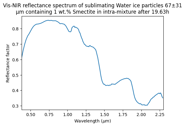 Vis-NIR reflectance spectrum of sublimating Water ice particles 67±31 μm containing 1 wt.% Smectite in intra-mixture after 4.35h