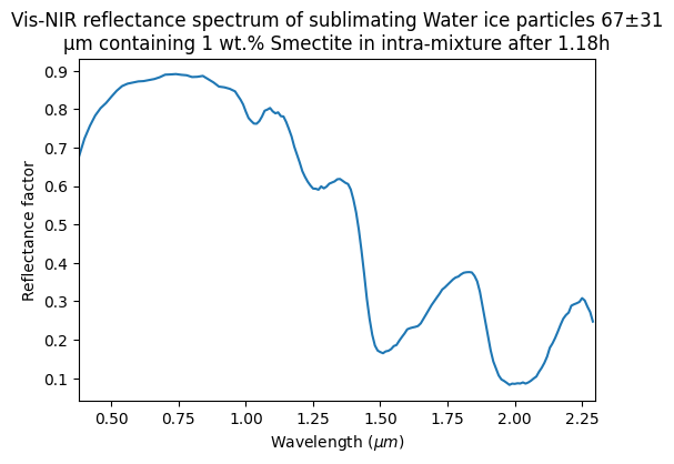 Vis-NIR reflectance spectrum of sublimating Water ice particles 67±31 μm containing 1 wt.% Smectite in intra-mixture after 1.18h