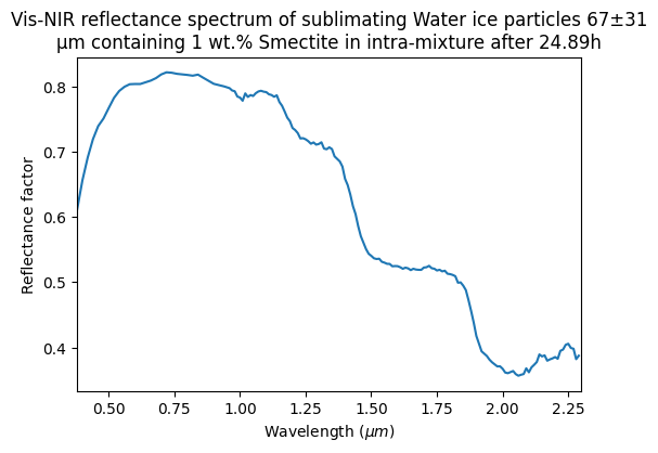 Vis-NIR reflectance spectrum of sublimating Water ice particles 67±31 μm containing 1 wt.% Smectite in intra-mixture after 24.89h