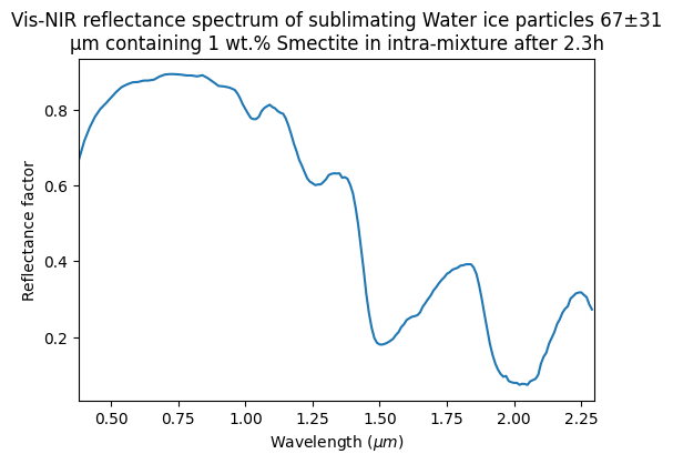 Vis-NIR reflectance spectrum of sublimating Water ice particles 67±31 μm containing 1 wt.% Smectite in intra-mixture after 4.35h
