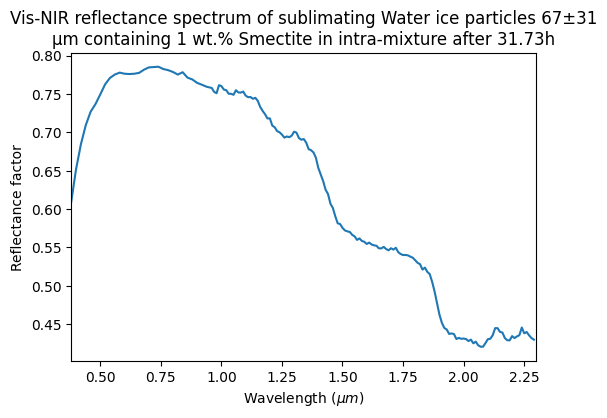 Vis-NIR reflectance spectrum of sublimating Water ice particles 67±31 μm containing 1 wt.% Smectite in intra-mixture after 4.35h