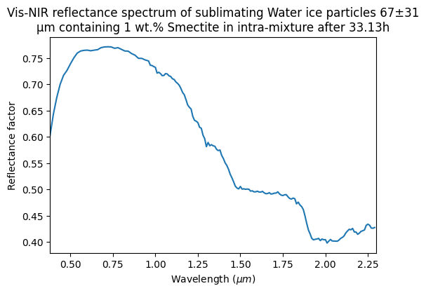 Vis-NIR reflectance spectrum of sublimating Water ice particles 67±31 μm containing 1 wt.% Smectite in intra-mixture after 33.13h